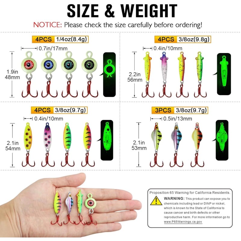 EVERYTHING GLOWS IN THE DARK: Each ice fishing jig is covered with a fluorescent coating that allows it to shine in the dark, helping your target fish locate it even in the deepest darkness beneath the ice. IMPORTANT: Upon receiving the package, expose it to light for a few minutes to ensure it glows vividly in the dark.