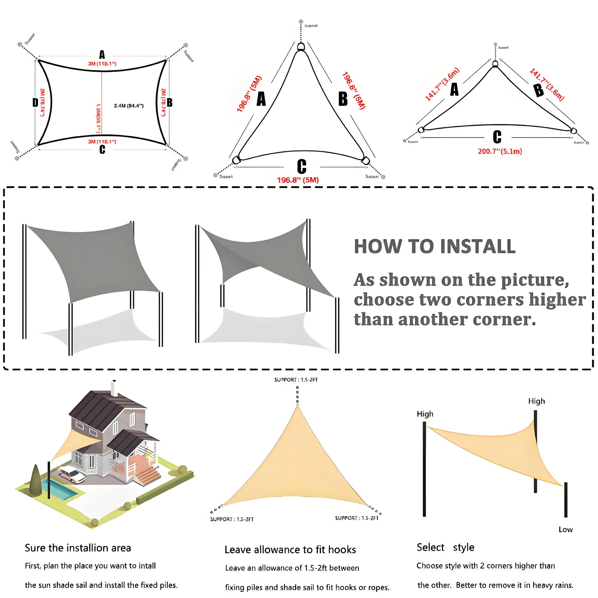 - Your shade sail uses 160gsm UV-protected polyester fabric with durable stitched seams and stainless steel D-rings at every corner for lasting performance.